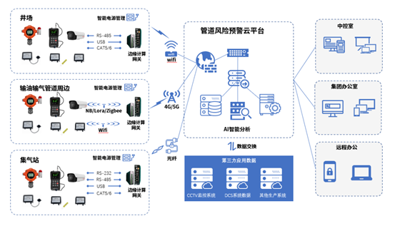 该平台集成物联网技术、大数据采集和分析、AI智能算法一体的综合性解决方案,利用物联网中各种专用的传感器对管道进行实时、定时的检测和监测,同时通过边缘计算网关采集现场多种传感器的数据,对于所采集到的数据进行初步分析、计算,并通过网络将现场的大量不同区域检测设备的数据传输到远端的数据中心,实现远程数据监控、存储、分析,并可根据分析结果与子系统或者第三方系统联动。